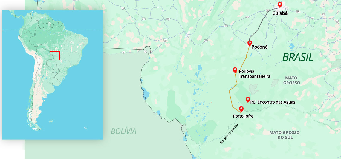 Nosso roteiro inicia em Cuiabá, capital do Mato Grosso, e segue pela icônica Rodovia Transpantaneira, 145km de estrada de terra que corta essa porção norte do Pantanal e revela, a cada ponte, um novo cenário de vida. Capivaras, tuiuiús, jacarés e cervos-do-pantanal dividem o mesmo território em uma convivência harmoniosa que encanta e emociona.